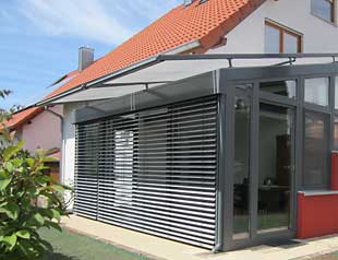 MarkisenWeit verbreitet ist der textile Sonnenschutz mit einer breiten Palette an Dessins. Die Gewebebahnen verlaufen in seitlichen Führungsschienen. Fassadenmarkisen sind für den senkrechten Bereich gedacht, können aber auch bei Dächern über 30 Grad Neigung eingesetzt werden. Für flachere Dachneigungen sind spezielle Wintergartenmarkisen mit Gegenzug entwickelt worden. Gebogene Komplettanlagen, die Dach und Fassade in einem Zuge verschatten, haben den Nachteil, dass z. B. eine Fassadenabdeckung als Sichtschutz immer auch den Ausblick in den Himmel verdecken. Geteilte Systeme sind also gezielter einsetzbar.