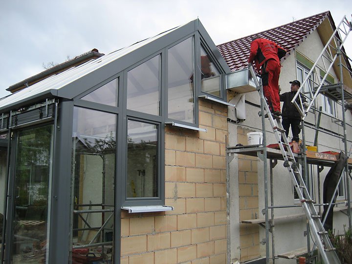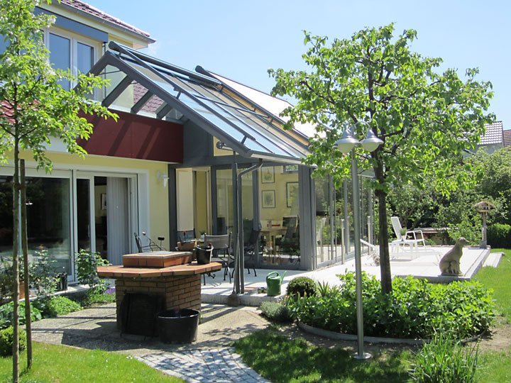 Ausführung: Aluminium-KunststoffkonstruktionBesonderheiten: Wohnwintergarten mit TerrassendachBaujahr: 2010