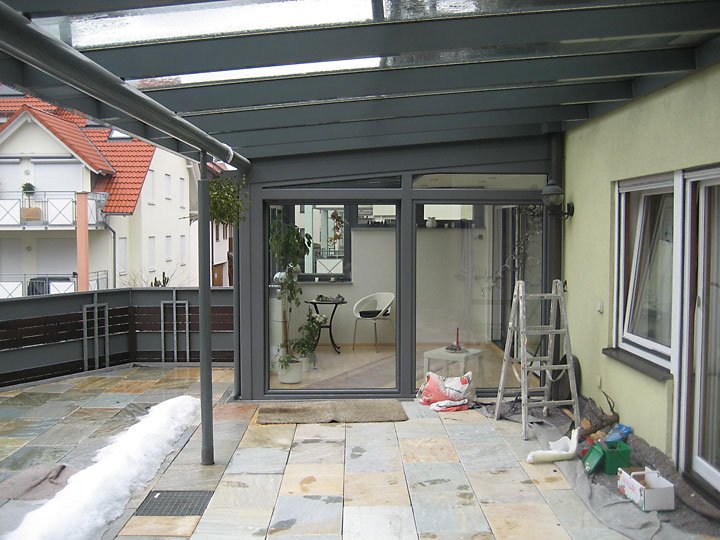 Ausführung: Alu-KunststoffkonstruktionBesonderheiten: Wintergarten und Terrassendach mit Stauraum für PolsterungBaujahr: 2009