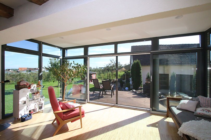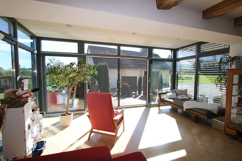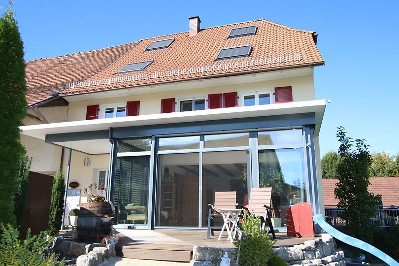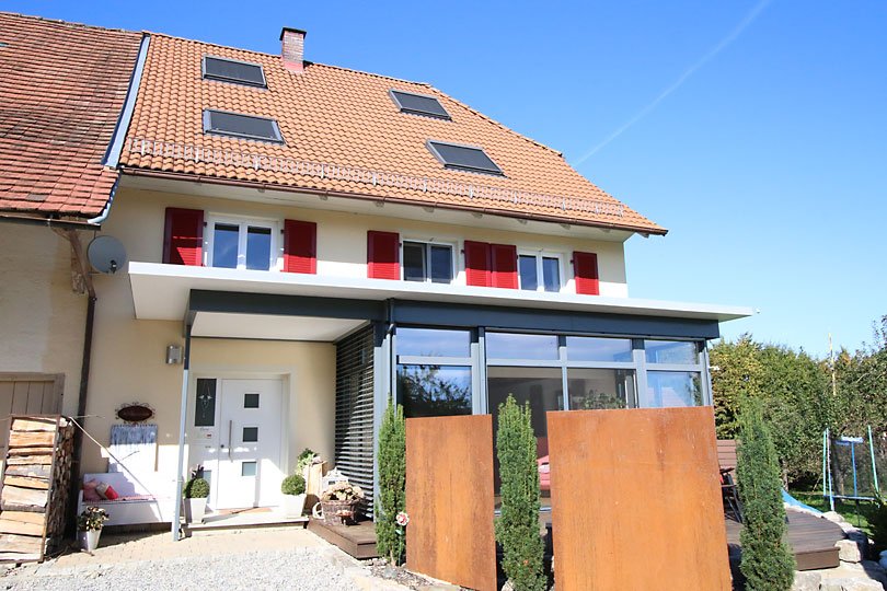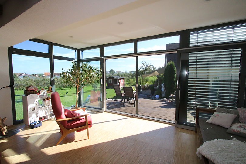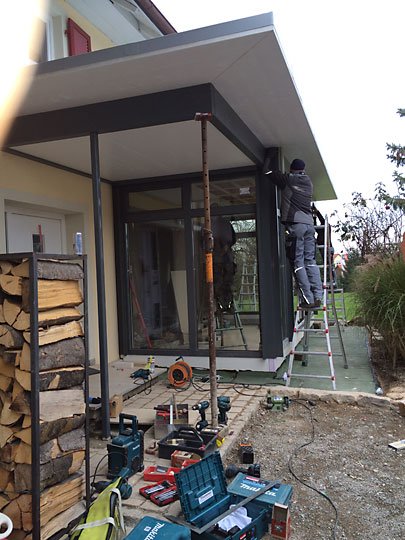 Ausführung: Aluminium-HolzBesonderheiten: Mit Flachdach und gleichzeitiger EingangsüberdachungBaujahr: 2014