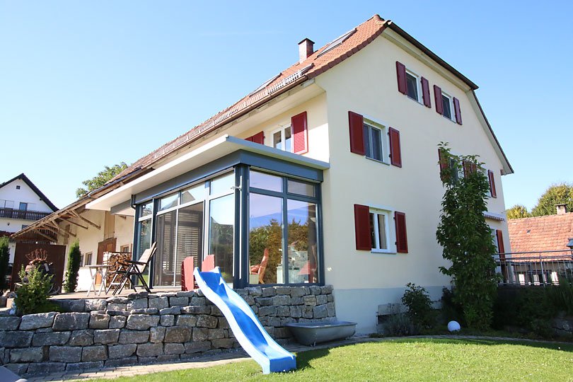 Ausführung: Aluminium-HolzBesonderheiten: Mit Flachdach und gleichzeitiger EingangsüberdachungBaujahr: 2014